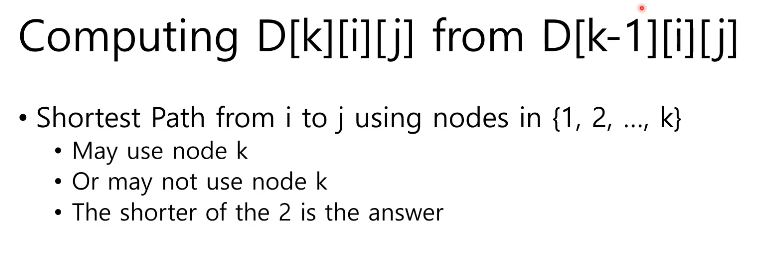 따라서 노드 k를 반드시 쓰는 shortest path => D[k-1][i][k]+D[k-1][k][j]