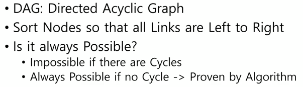 topological sort = 위상정렬(모든 엣지가 한방향으로 간다) (사이클이 없다면 항상 가능)