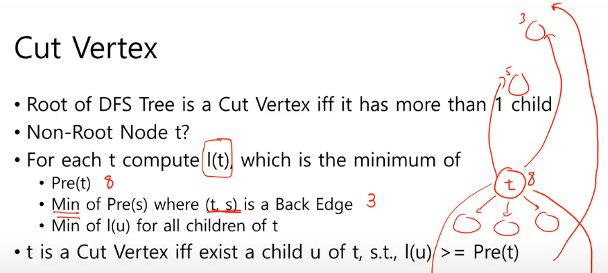 셋 중 하나라도 못올라가는 게 있으면 t는 cut vertex