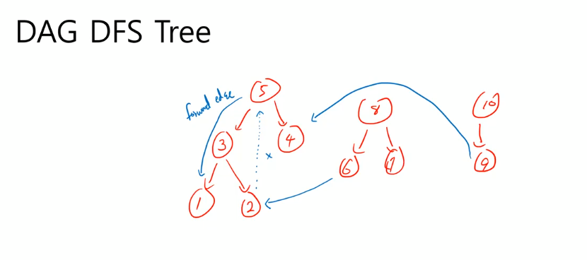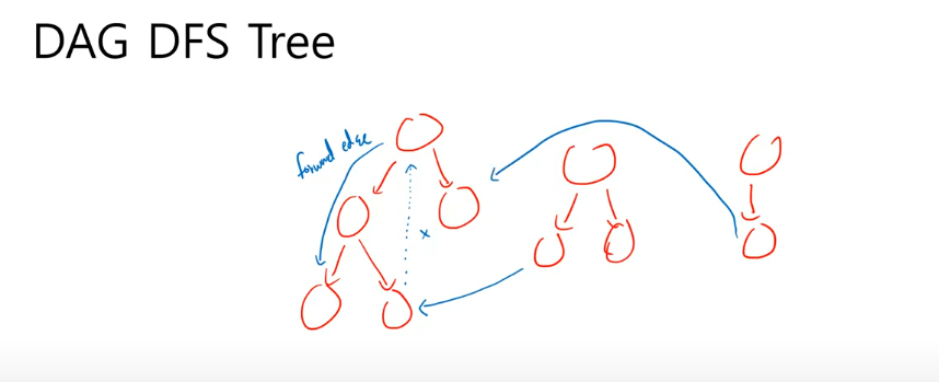 사이클이 있을 수있으므로 back edge, forward edge가능