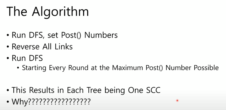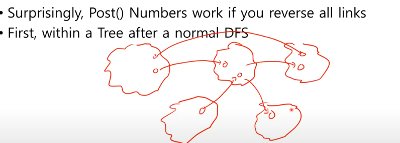 전체에서 SCC를 무시하고 모든 노드의 post 번호를 보면 제일 큰 것이 a or b일 것이다.