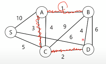 알고리즘에 이미 추가한 엣지도 있고, 아직 추가하지 않은 엣지도 있다.